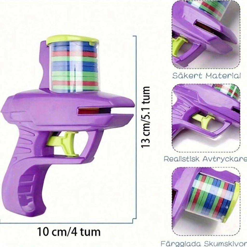 Blastern skjuter lätta skumdiskar som flyger genom luften och skapar en rolig och dynamisk lekupplevelse.