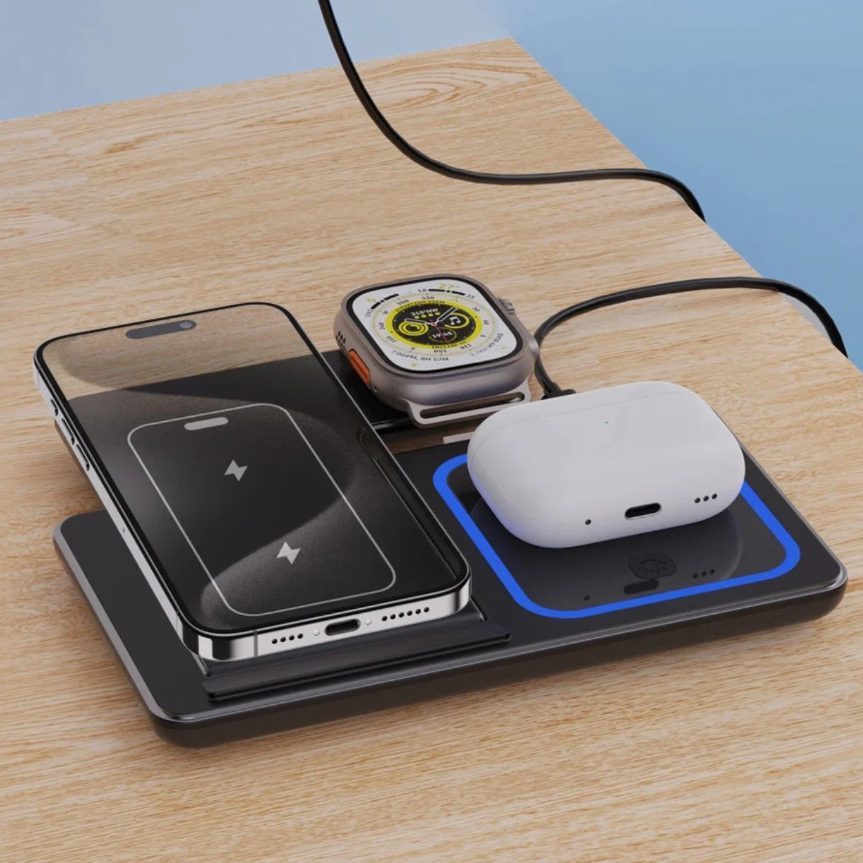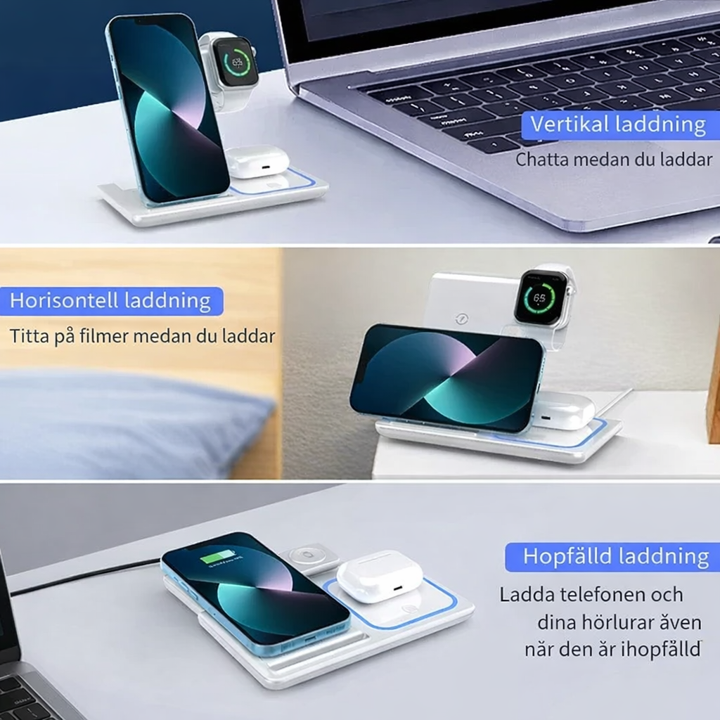Med denna 3-i-1 trådlösa laddstation kan du ladda mobiltelefon, smartwatch och trådlösa hörlurar samtidigt.